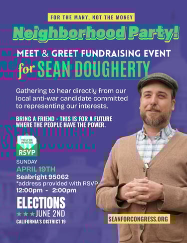 Sean is running as a Democrat in the June primary. He’ll be up against our current representative, Jimmy Panetta, along with two Republicans, a Libertarian, and two unaffiliated candidates. This is not like Presidential primaries, which are organized by party. If Sean comes in second, he’ll face off with the winner (most likely Jimmy Panetta) in the general election in November.