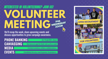 Join our 2026 Volunteer Kickoff on Jan 4 at 7pm on Zoom to help get Sean on the ballot. RSVP Here.